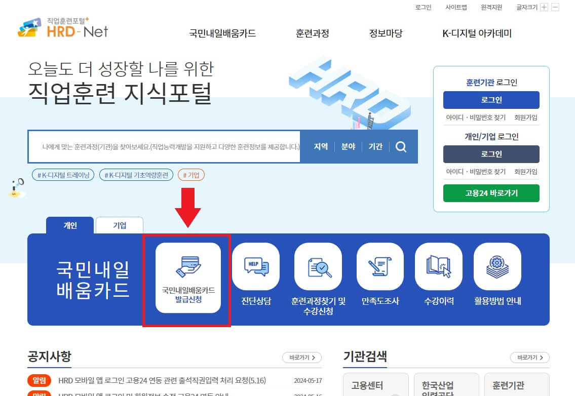 HRD-Net 사이트에 접속하면 바로 보이는 빨간 박스를 클릭하여 신청합니다.