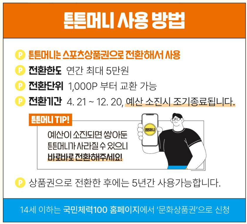 참여대상은 만 11세 이상 우리나라 전국민이라면 누구나 참여하실수 있으며, 스포츠 활동에 참여하여 튼튼머니를 적립하게 되면 약국과 병원에서사용도 할수 있고 스포츠 용품도 구매하실수가 있습니다.
